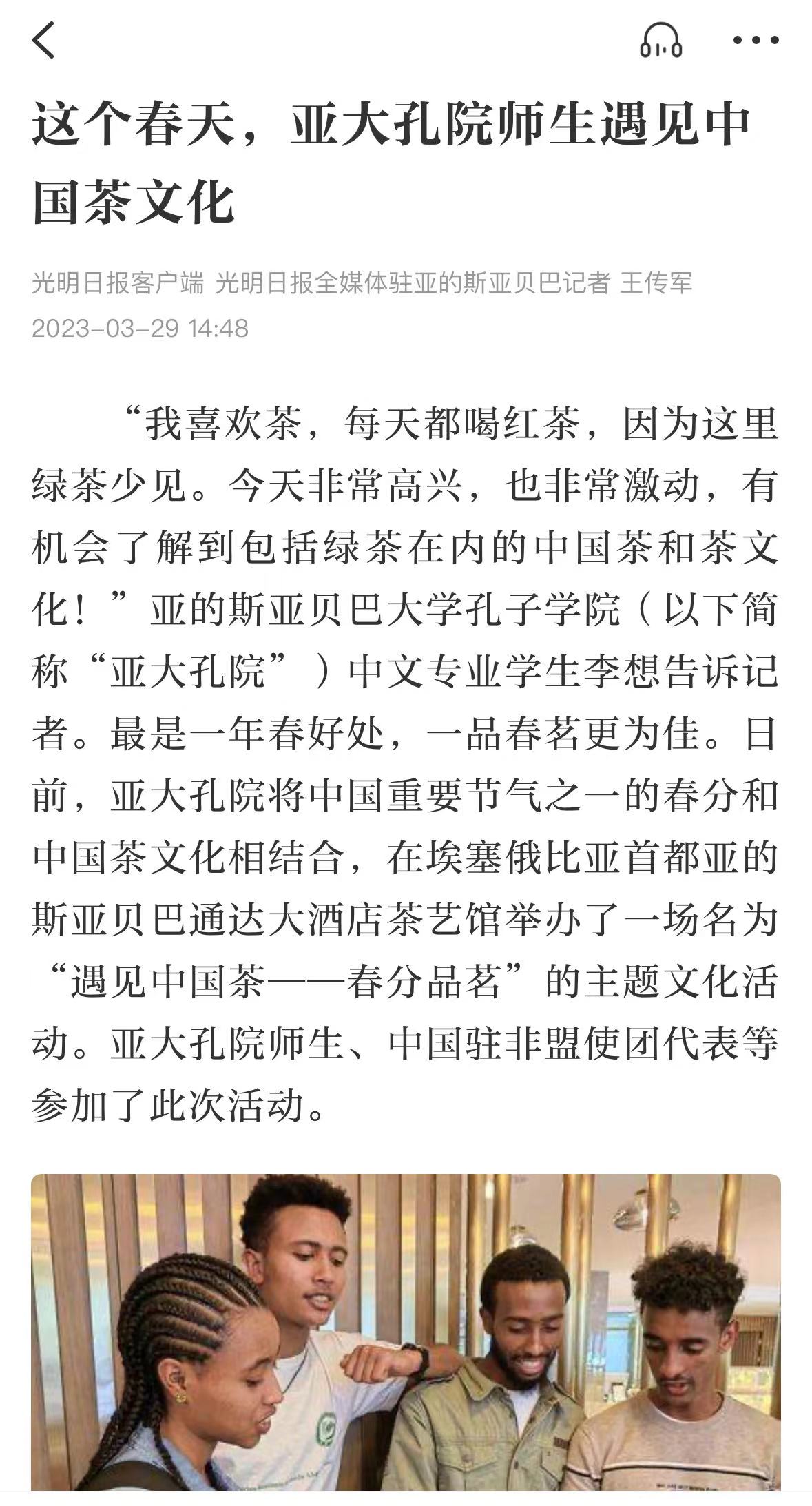 今日《黑暗日报》客户端以“那个秋天,亚年夜孔院师死逢睹华夏茶文明”为题报导埃塞俄比亚亚的斯亚贝巴孔子教院将秋分战华夏茶文明相联合举行“逢睹华夏茶——秋分喝茶”焦点文明举动。